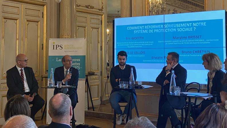 Le 17 mars dernier, les réformes sérieuses à apporter à notre système de protection sociale étaient au cœur des réflexions des intervenants : Maryline Brisset (expert-comptable, associée au sein du cabinet FIDELIANCE, représentante du Conseil national de l’ordre des experts-comptables), Erwann Tison (économiste et directeur des études à l’Institut Sapiens), Franck Le Vallois (directeur général de France Assureurs) et Eric Woerth, ancien ministre du Budget, de la Solidarité et du Travail, et actuel président de la commission des Finances de l’Assemblée Nationale et Bruno Chrétien (président de l’IPS).